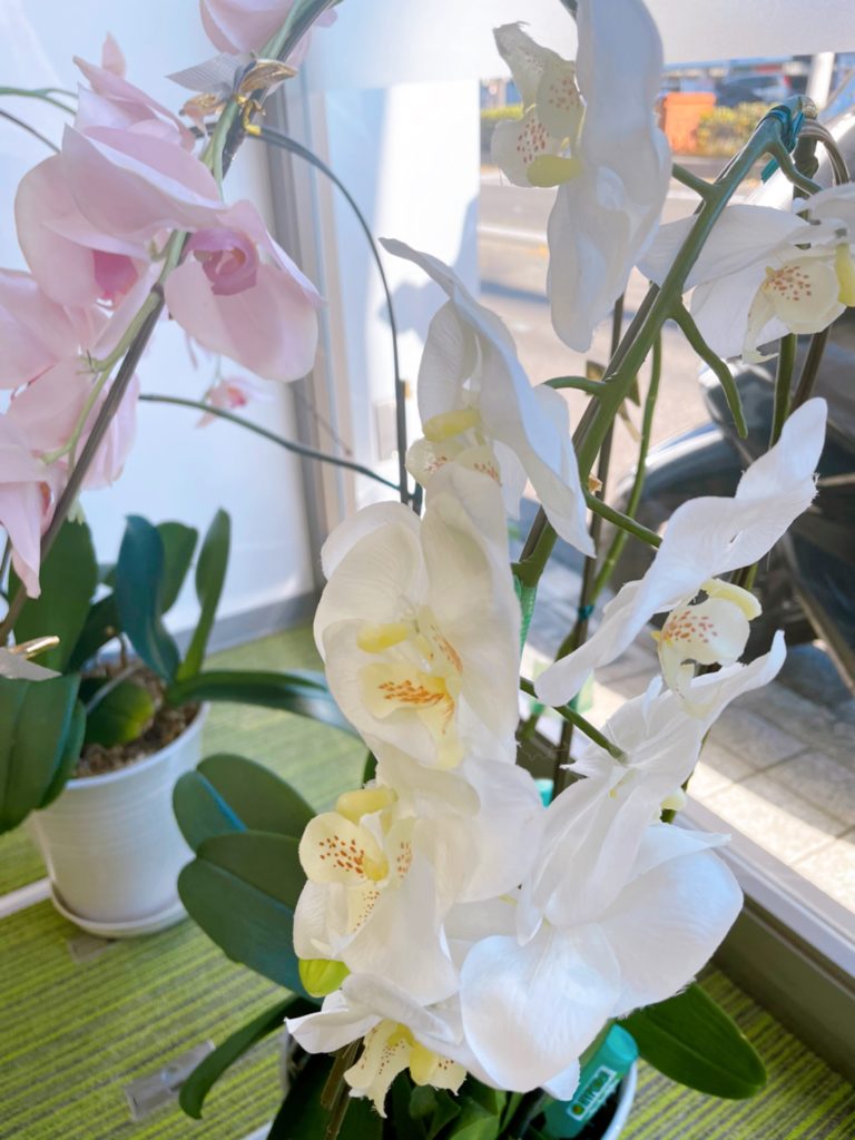 先日、事務所の前をよく通りがかるという女性が花が終わった胡蝶蘭に造花を付けてくださいました。