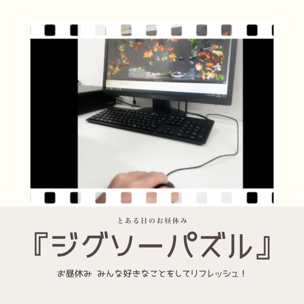 パソコンでジグソーパズルをしている利用者さん、100ピースを超えるものでもお昼休み中に完成させます。